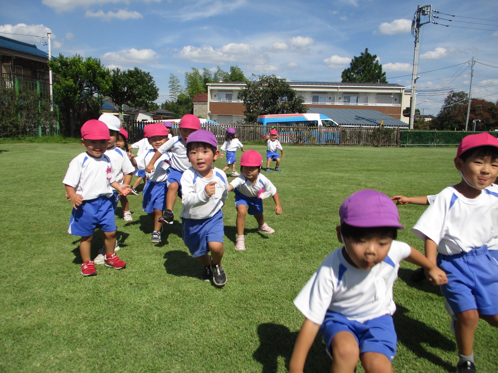 お腹がいっぱいになったら、みんなで鬼ごっこやだるまさんがころんだを楽しみました。クラスのお友だちだけではなく、すみれ組・つくし組のお友だちみんなで楽しんだ芝生遊び。運動会の練習もみんなで楽しみながら頑張っていこうね!!