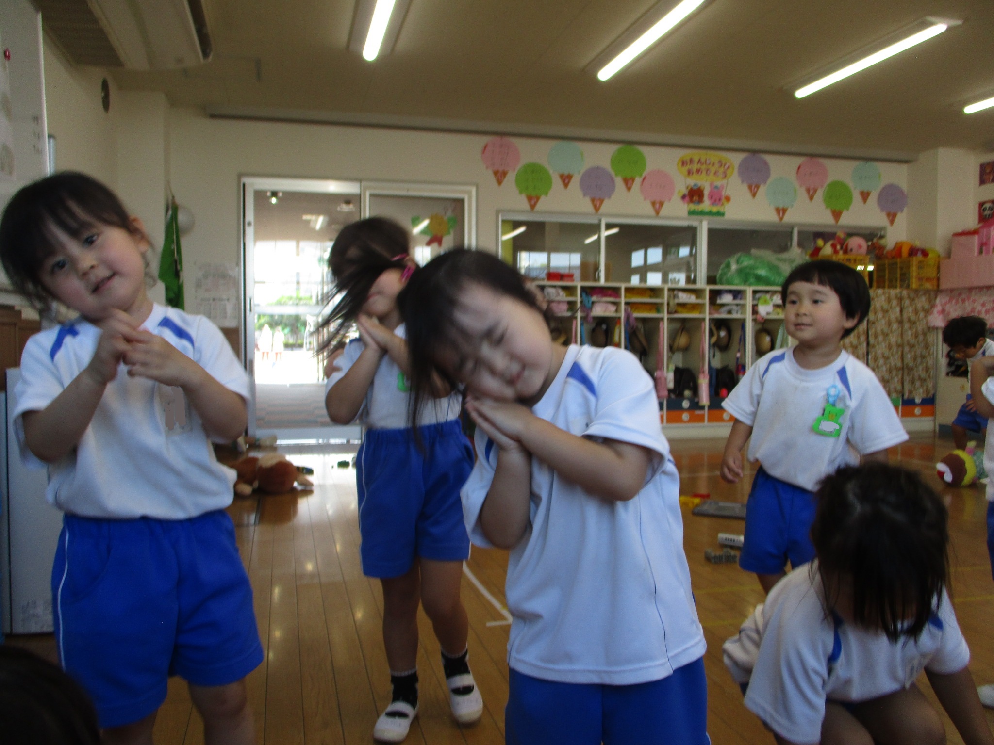 今日、年少組では運動会のおゆうぎの練習を行いました!園庭では「〇〇ちゃん掛け声大きくてかっこいいね~!」と褒めると、「きらきらポンポン!」と掛け声を大きな声で言いながら踊る子どもたちの一生懸命な姿が見られました。