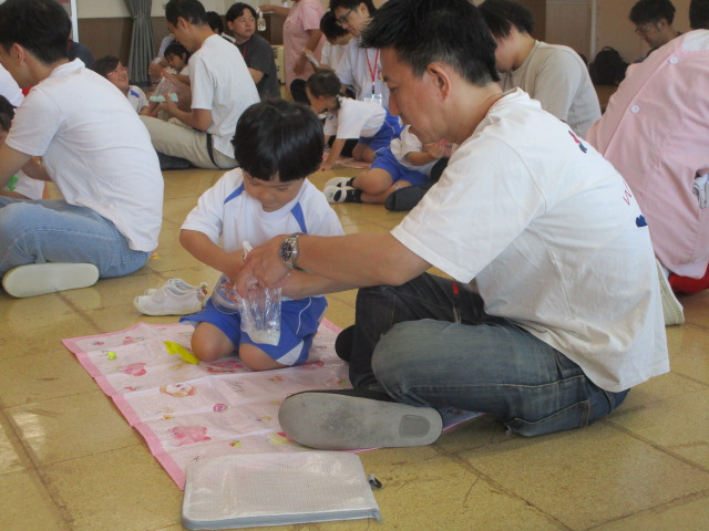 今日はお友達が楽しみにしていたおやじの会を行いました。初めはお父さんと一緒で少し恥ずかったお友だちもすぐにニコニコでとても嬉しそうでした。