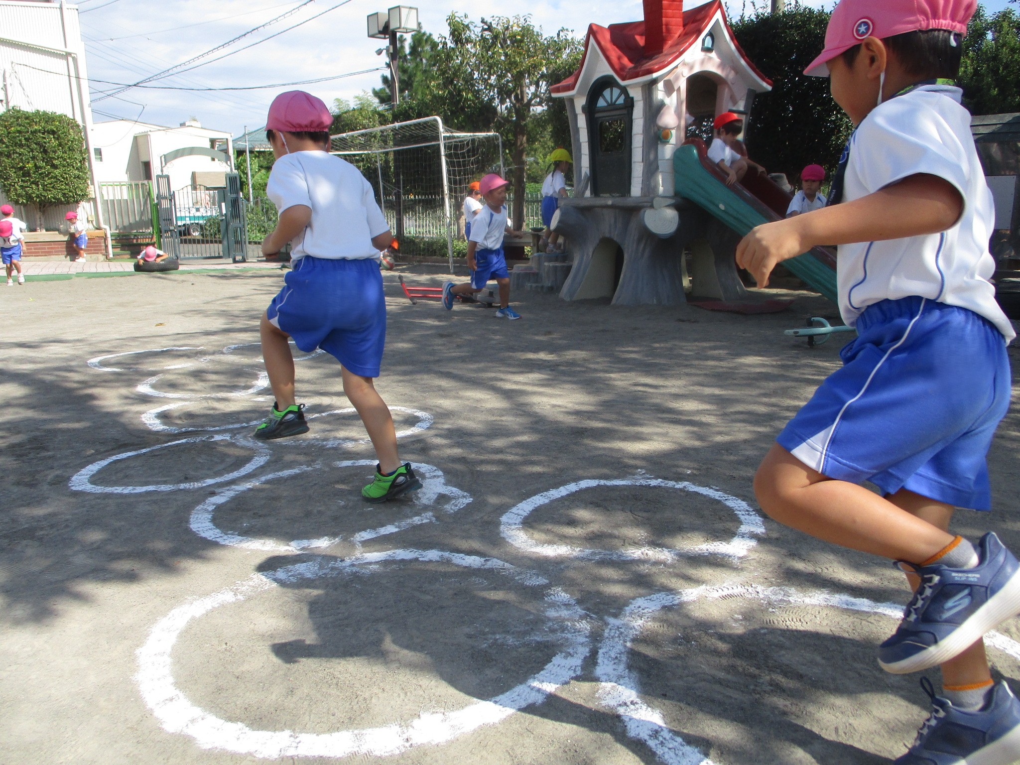 今朝は風が涼しくて秋らしい気持ちのいい朝の始まりでした。毎朝一番に園庭にかけだすもも組のお友達は「一緒に遊ぼう!」とお友達を誘って早速好きな遊びを始めています。タイヤを並べてピョンピョン飛び始めると「先生、白い線のやつ書いて!」とリクエストしてくれました。