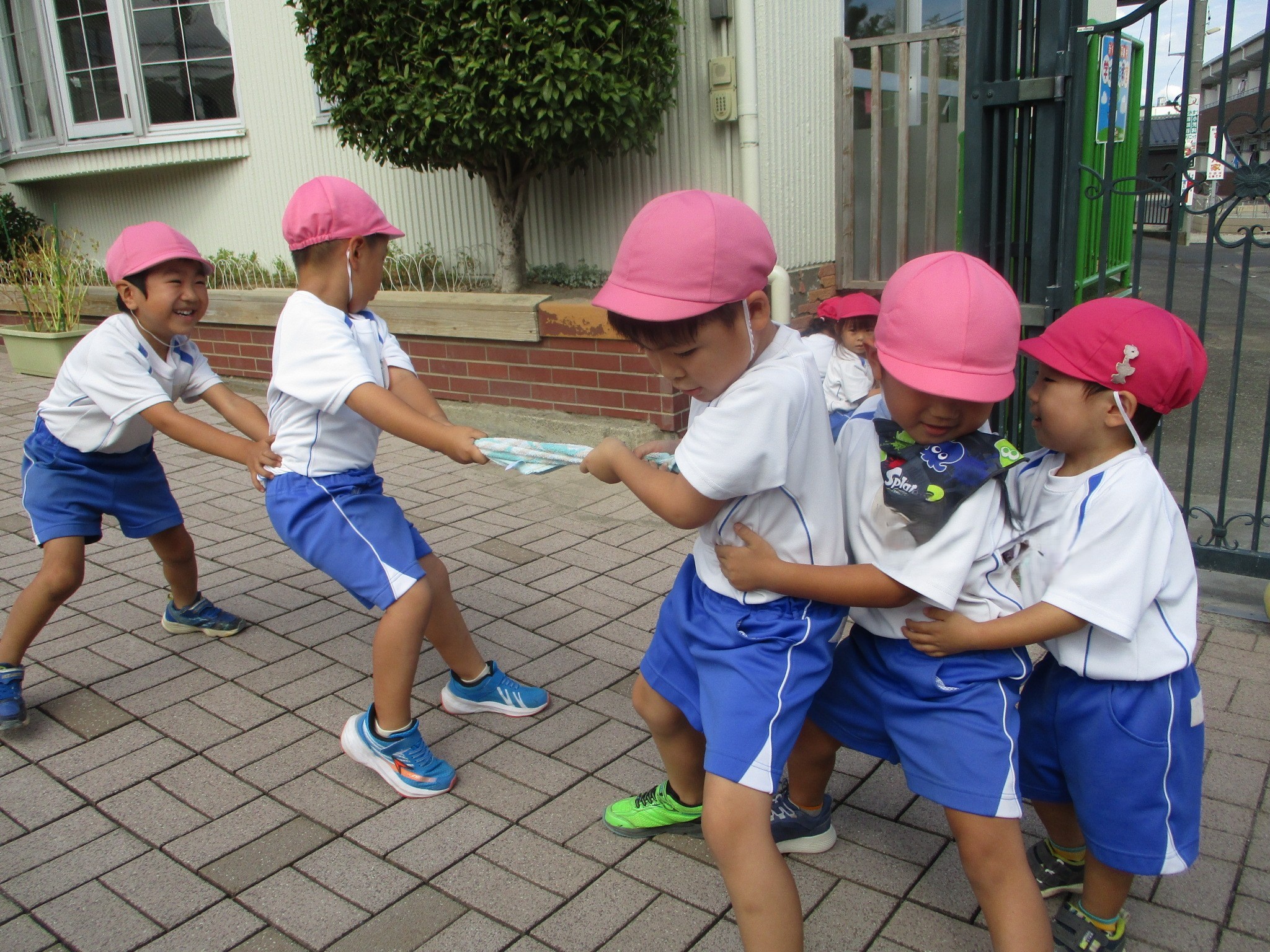 すると、「綱引きやりたーい!」と元気もりもりです。後ろにお友だちもくっついて「負けないぞー」と力が入ってきました。