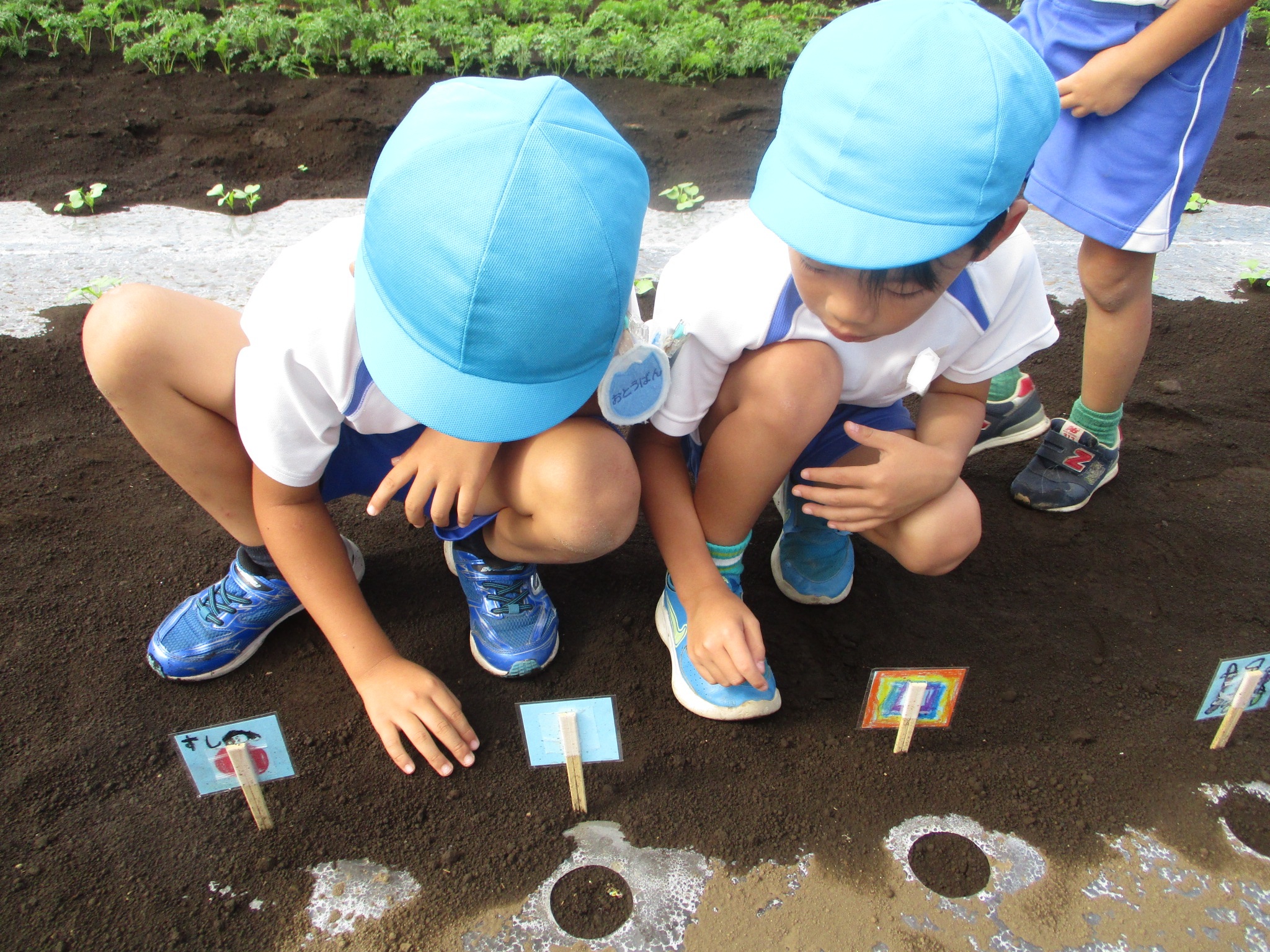 おととい、大根の種を植えました。種といえば黒のイメージがありますが、なんとエメラルドグリーン色!初めてみる種の色に、みんなびっくりしていました。畑の先生に聞くと、種に着色料を付け、落としてもわかるようになっているそうです。他にもいろいろな色がありようで勉強になりました!3日経った種はどうなっているか、お当番が畑に見に行きました。
