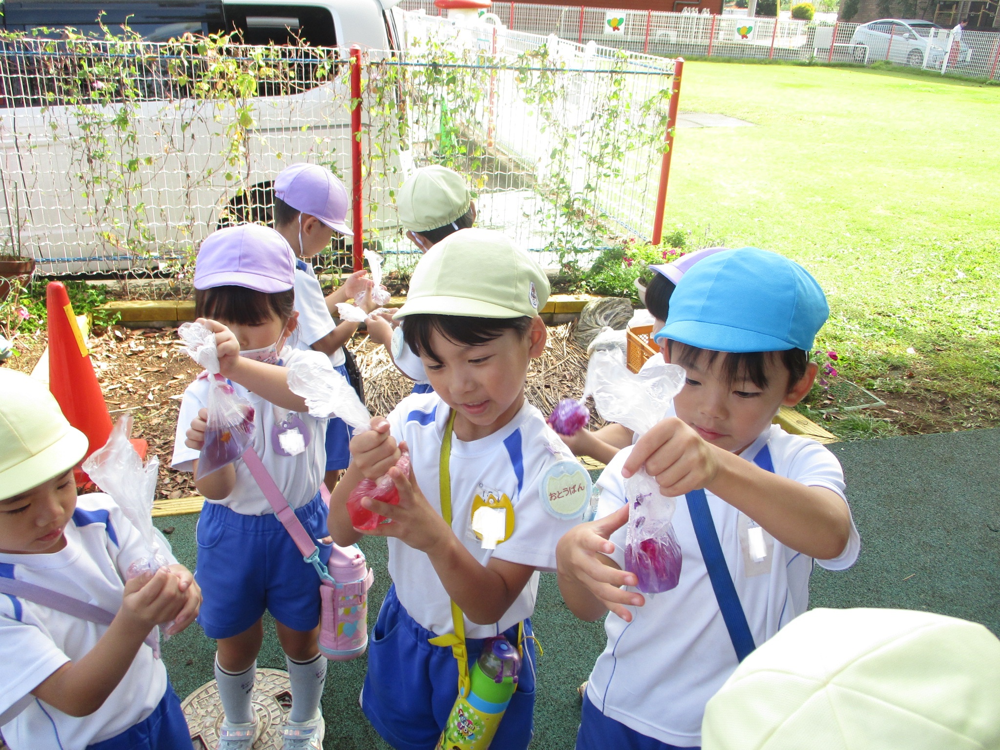 畑の帰り道では、お花を袋に入れて色水を作りました。組み合わせる花びらによって色の出方が違い、どんどん濃くなっていく色水に興味津々でした!