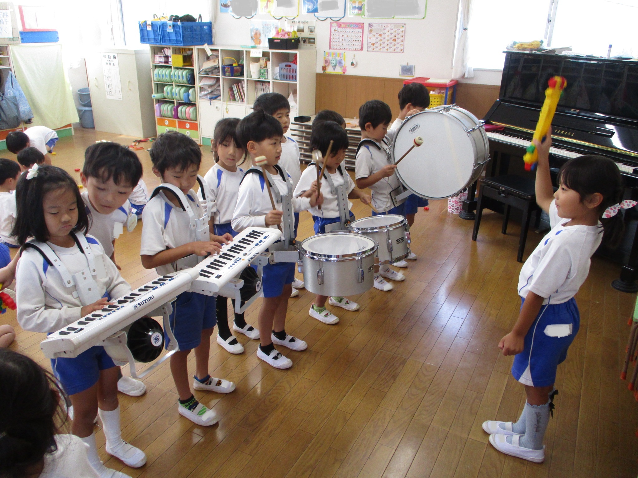 お部屋に戻ってからは、毎日頑張ってきた運動会の練習を少しお休みして、ゆっくり過ごしました。 以前から鼓笛隊の他の楽器も弾いてみたいというリクエストがあったきく組さん、今日は太鼓やシンバル、キーボードなど思い思いの楽器を楽しみました♪ 指揮をやってくれる子も居てなんと合奏が始まりました!!