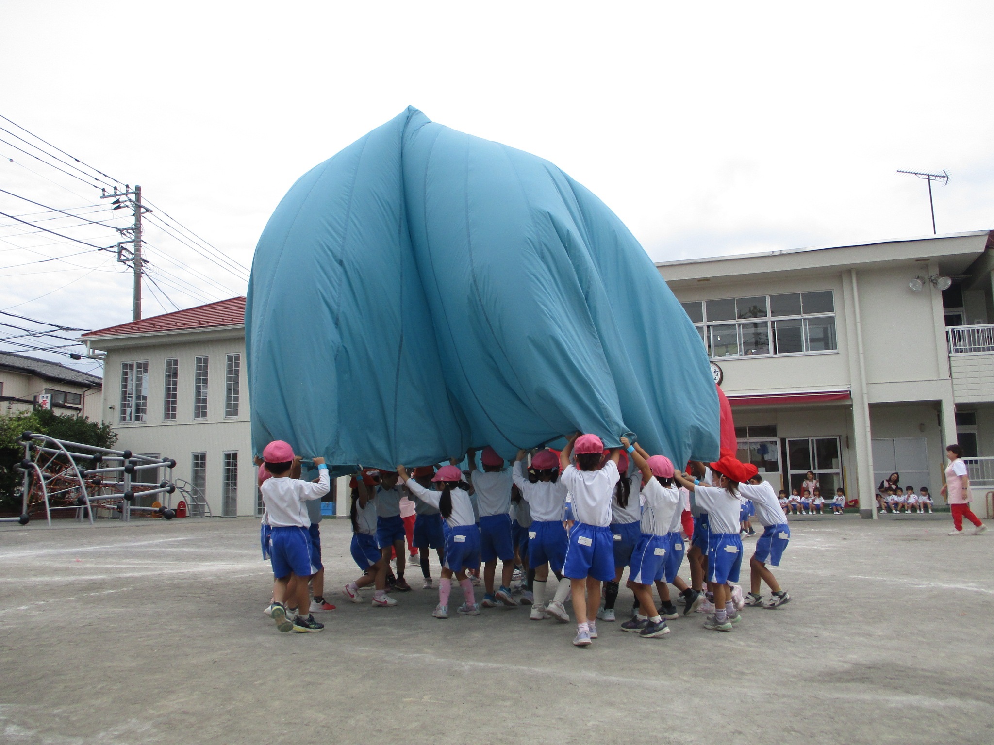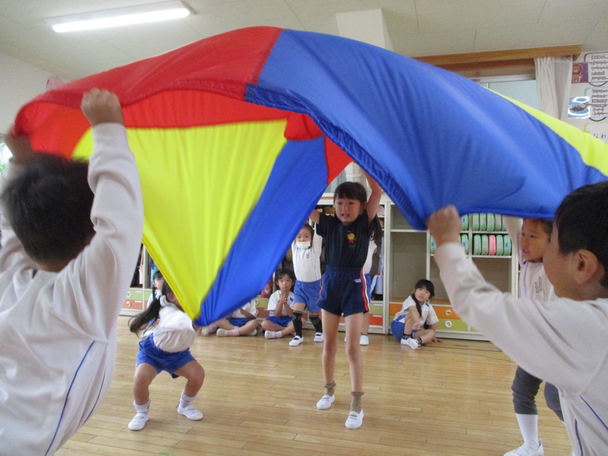 バルーンがみんなの力で膨らむ気球という技は2回連続で行います。「バンザーイ」のかけ声で思いっきり腕を上げて挑戦するとバルーンが大きく膨らみました!!