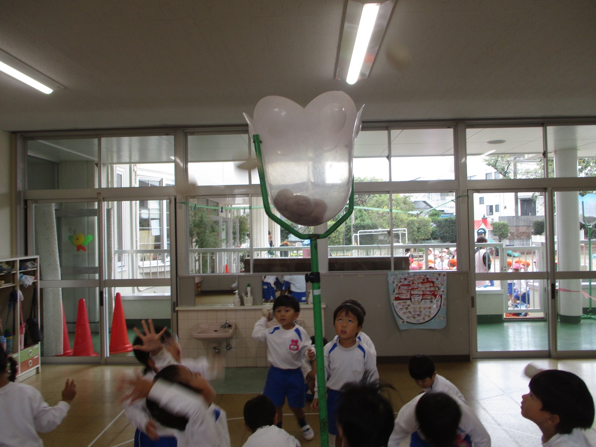 そうです!玉入れのかごです。練習を始めたばかりの時は、投げても投げてもチューリップのかごまで届かず、1~2個しか入らなかった玉が今日は11個も入るようになりました!!