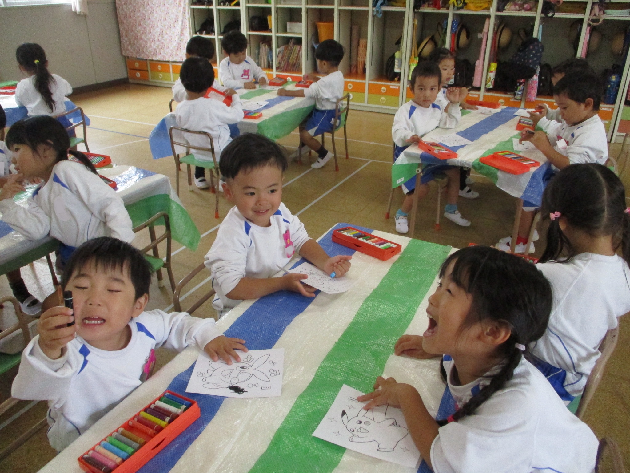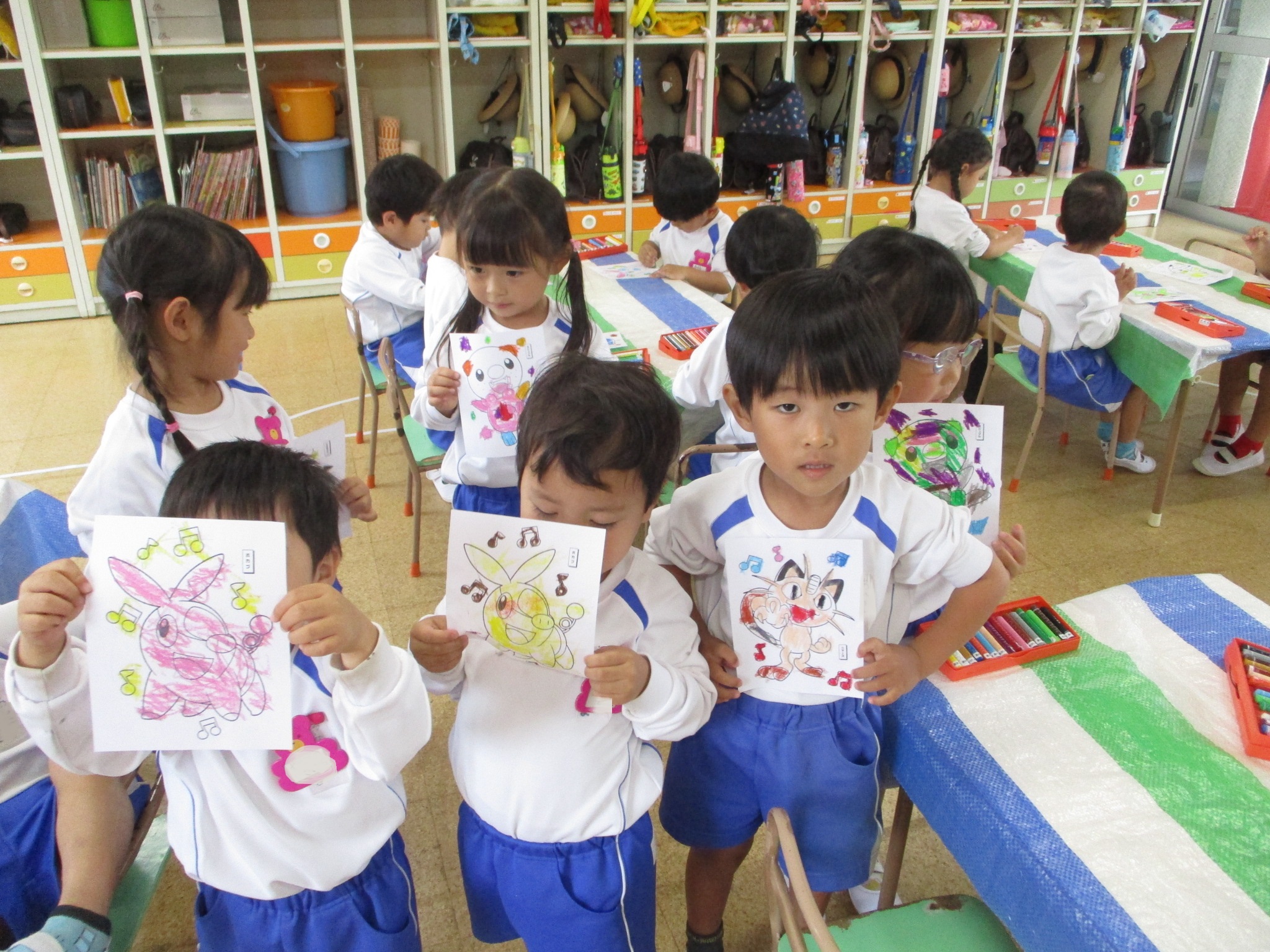そして玉入れを楽しんだ後は、運動会のポケダンスを頑張っている子どもたちのもとにポケモンが遊びに来てくれました。白黒のポケモンに思い思いの色を塗ってあげて・・・