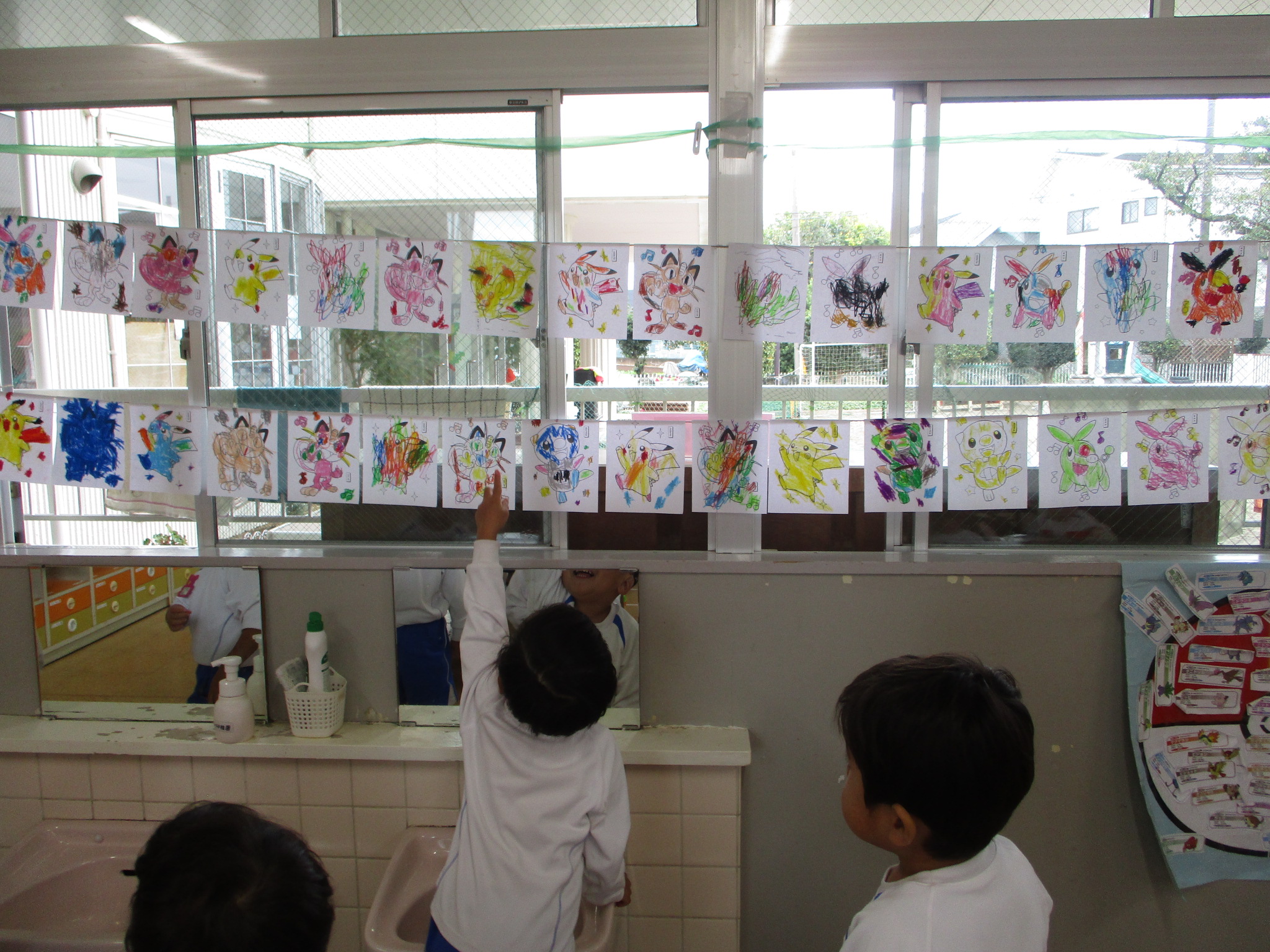 窓一面に飾られたポケモンたち。秋風に吹かれてひらひら揺れています。みんなを応援してくれてるみたいだね!!明日も元気いっぱい楽しもうね!!