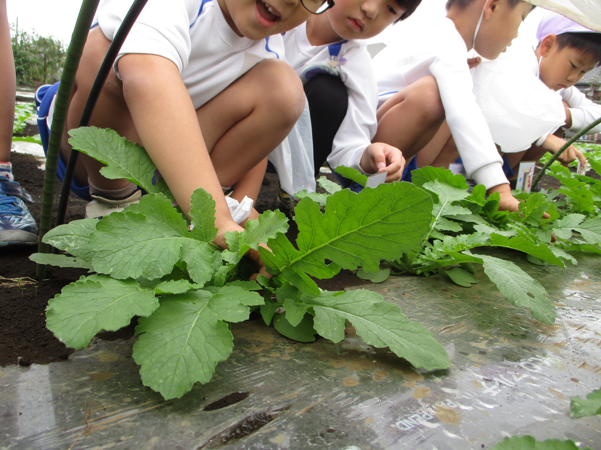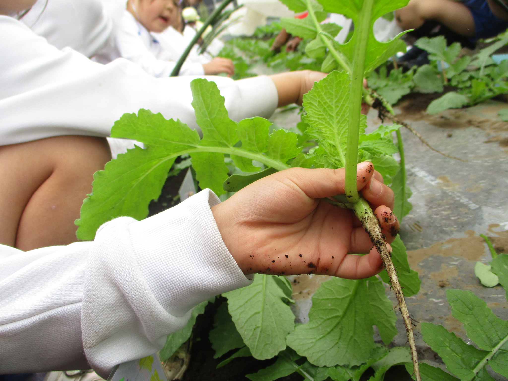 今日は、先日年長さんが畑に植えた大根の間引きをしました。自分で書いた名前の看板を見つけると「あった!」と大きく育った大根の葉っぱを上から下から覗く子供たちの姿がありました。