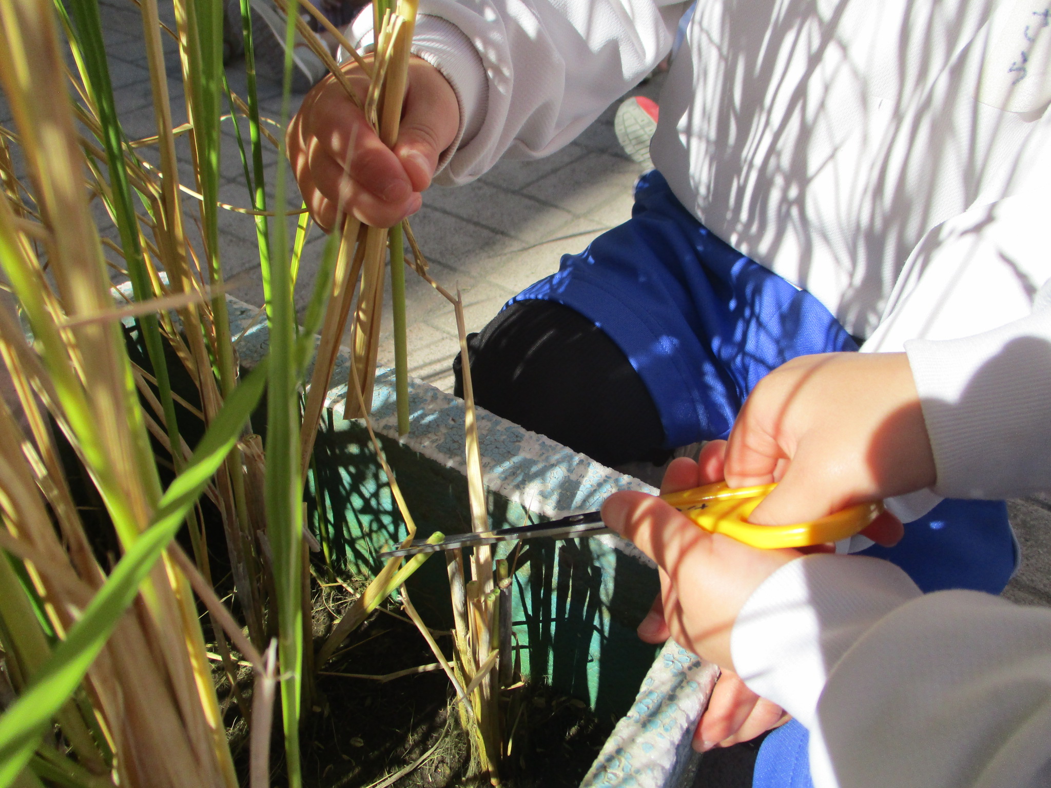 5月に植えた苗が大きくなり、稲刈りを体験しました。稲穂は子どもたちの背丈ほど大きくなって、触ってみると固く、「これ、お米なの?」と不思議そうな表情でした。