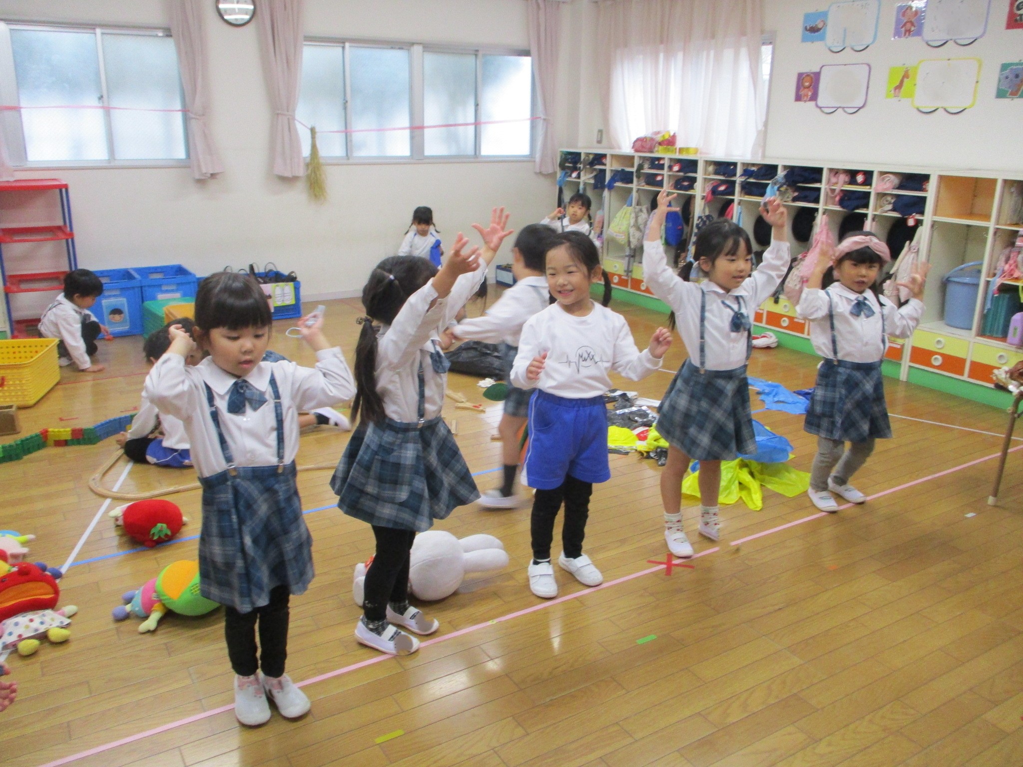 遊びの時間でも「曲を流して!」と声があり、流すと今度は自主練のスタートです!(笑)子どもたちの取り組む姿や表情を見ていると、お友だち同士でのやりとりやみんなで取り組むからこそ、感じることができる経験を目一杯感じているように思えました。演じていく中でなりきる楽しさや協調性が育っている姿に微笑ましく感じます。