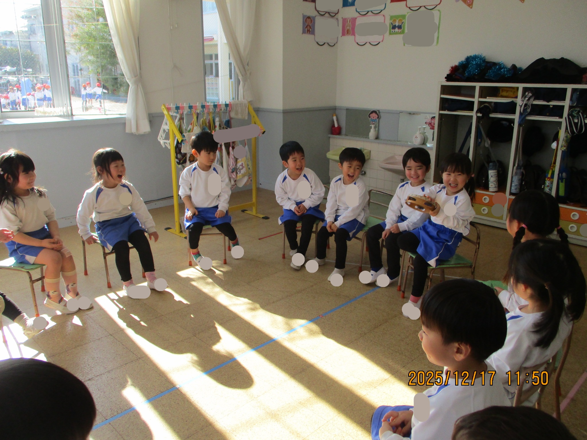 お部屋に戻ったらみんなで2学期頑張ったのでお楽しみ会をしました。初めは鈴をだれが持っているか探すゲームと爆弾ゲームをしました。