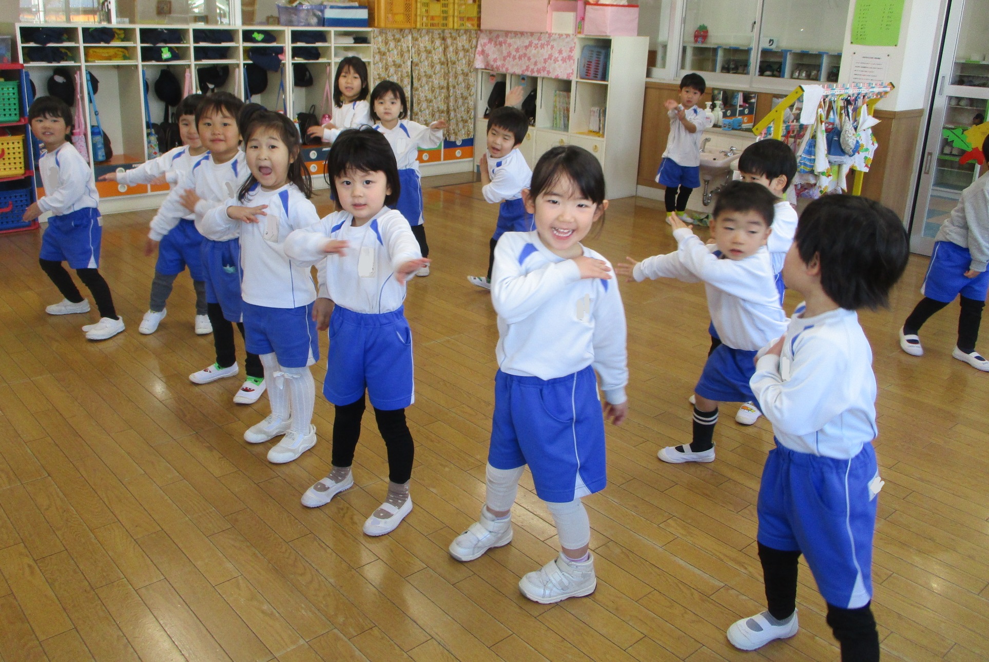 この写真は前奏の振り付けで「ヒーローみたいにかっこいい音だからヒーローのポーズにする!」と言って作られた振り付けです!生活発表会のお遊戯を通してみんなで踊る楽しさを知ることができたからこその姿だなと微笑ましかったです♡