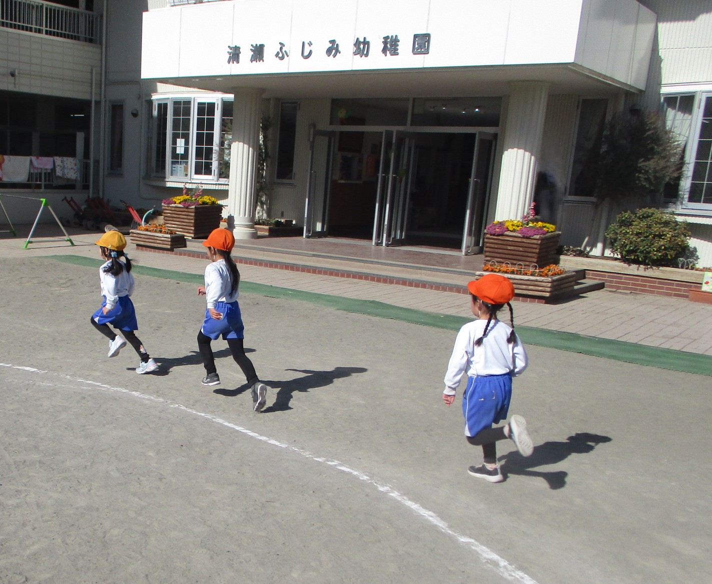 男の子と女の子に分かれて走りました。自分たちで何周したのか数えながら走ることも難しく、走っていて疲れる気持ちと、回数がごちゃごちゃになって、困っている姿が可愛らしかったです。