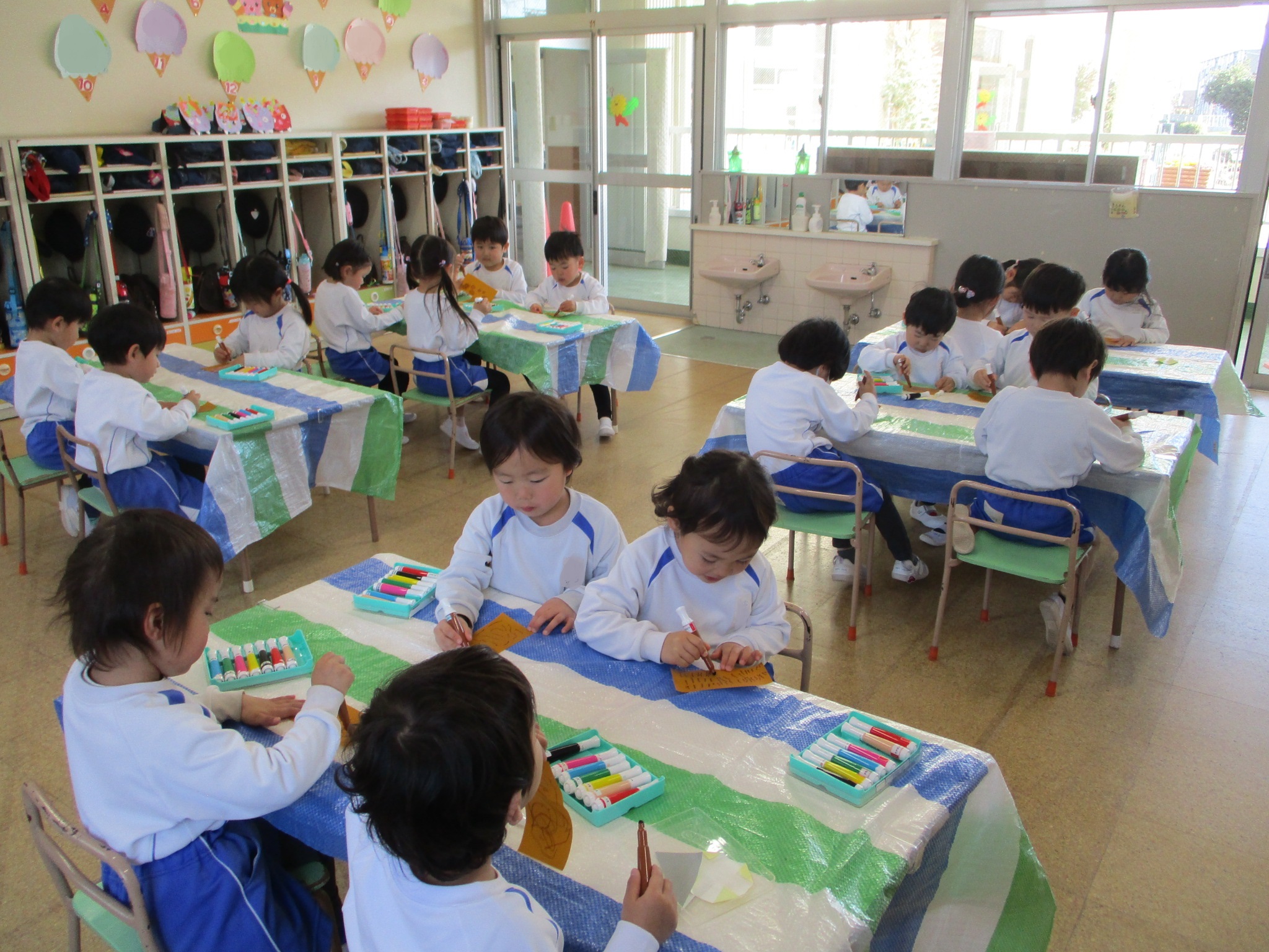 そして製作では折り紙を使っておでん作りを楽しみました。角と角を合わせて折ったり、ちくわに見立てて焼き色をロケッタンで描くと美味しそうなおでんが完成しました。
