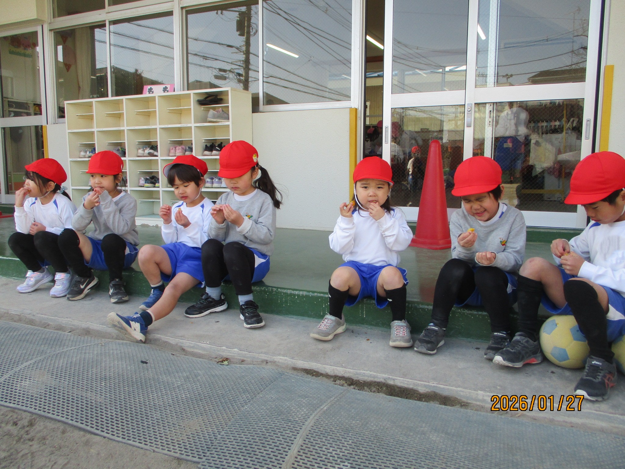 お外ではきんかんが生っているので、みんなで仲良く並んで食べました♡思っていたよりも酸っぱかったようで表情がとても微笑ましかったです。明日は製作の仕上げ!さるさんに温かい温泉作ってあげようね♡