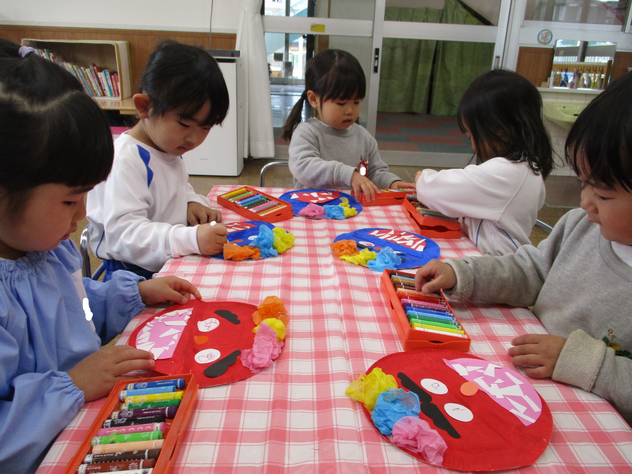 <おにのお面製作 好きな色で顔を塗ったよ♪>