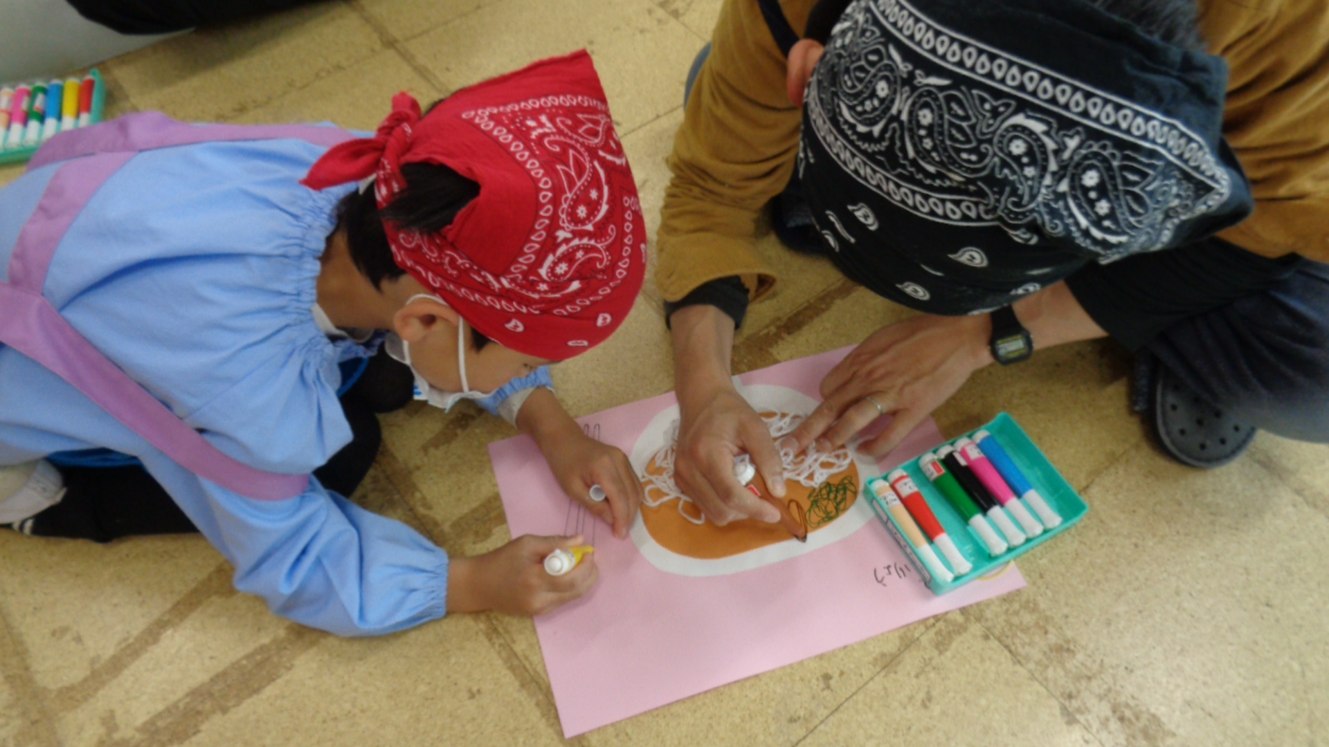 こねた生地を寝かせている間に毛糸を使ったうどんの製作を行いました!