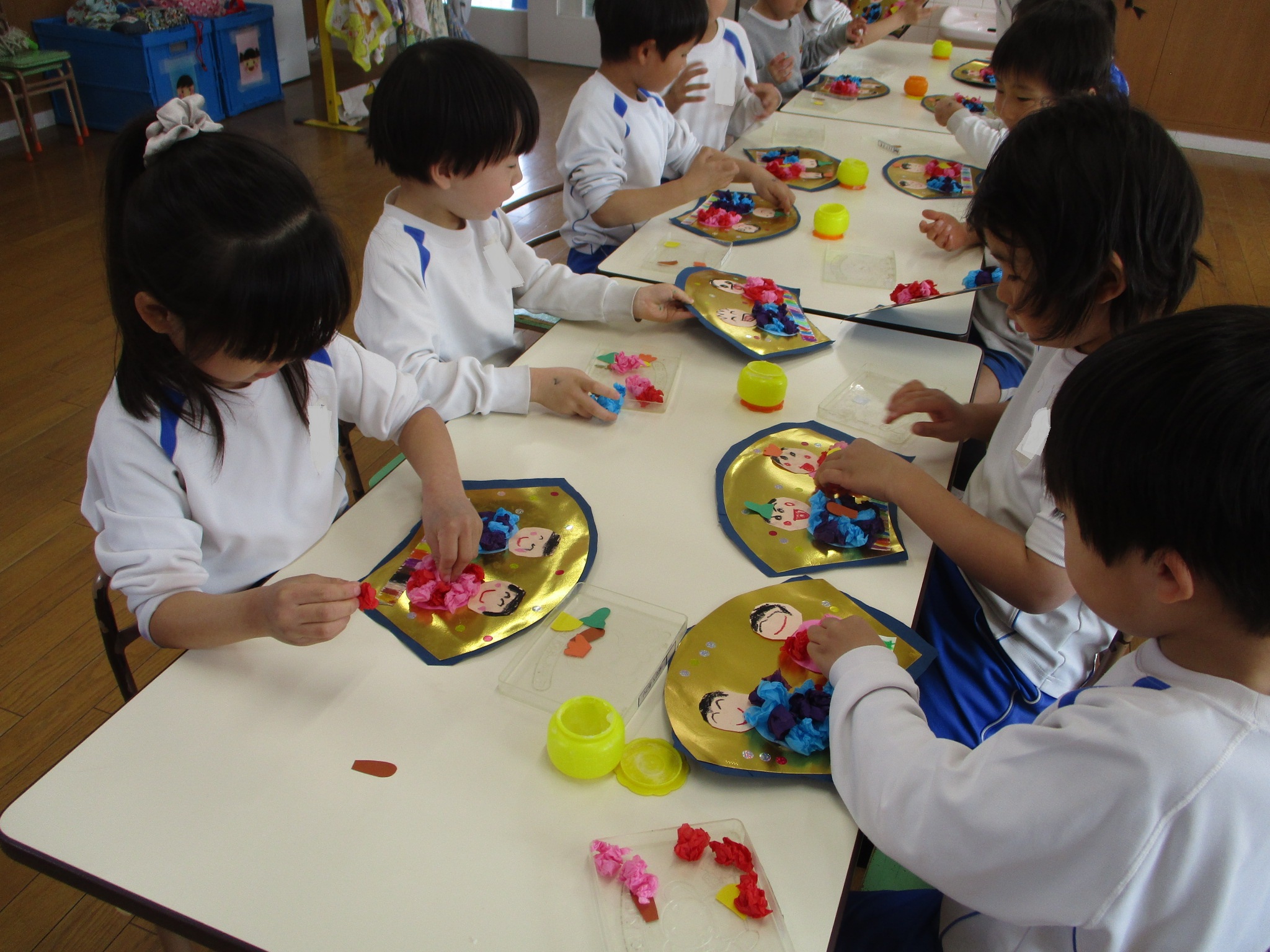 お部屋では、「ひなまつり製作」を行いました。 このひなまつり製作が、幼稚園で行う最後の製作であることを伝えると、「もっとやりたかった!」という声が、たくさん聞こえました。 また、今までたくさん使ってきたハサミとのりに別れを惜しむ姿も見られ可愛かったです♡