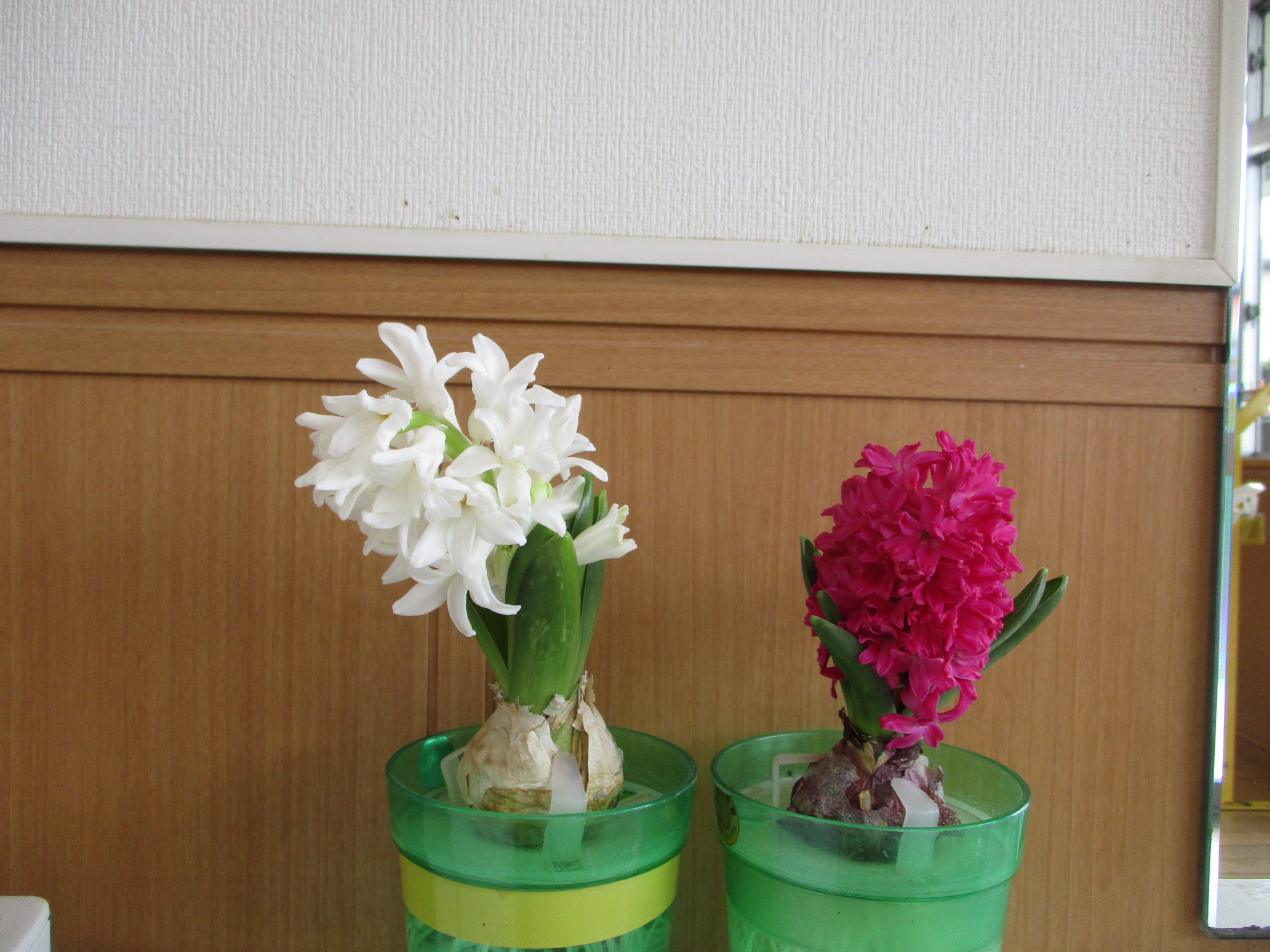 さて、11月5日に水入れした、ヒヤシンスがもうすぐ満開になります。「根っこがでてきたね」「緑の芽がタケノコみたい」とどんな花が咲くか楽しみにしていたもも組の子どもたちです。